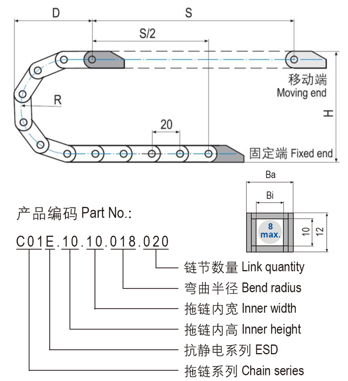 C01E.10抗靜電微型塑料拖鏈體積極小,基于一片式設計重量輕特別適用于高速運動。C01E.10抗靜電微型塑料拖鏈適用于較小安裝空間,多種尺寸規格可選。