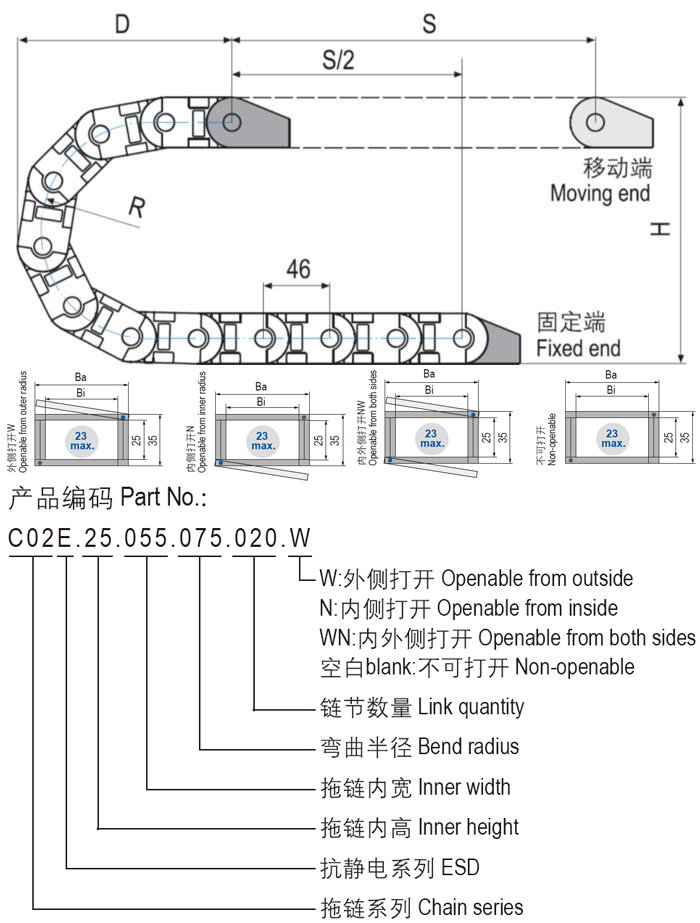C02E.25抗靜電通用型塑料拖鏈?zhǔn)菓?yīng)用范圍廣泛的產(chǎn)品,簡(jiǎn)單而多功能的組裝結(jié)合堅(jiān)固性,高強(qiáng)度配合更安靜的運(yùn)動(dòng),更長(zhǎng)的電纜壽命和許多安裝選項(xiàng)