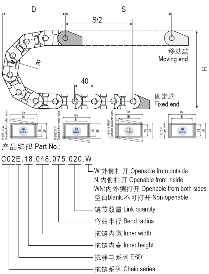 C02E.18抗靜電通用型塑料拖鏈是應用范圍廣泛的產品,簡單而多功能的組裝結合堅固性,高強度配合更安靜的運動,更長的電纜壽命和許多安裝選項
