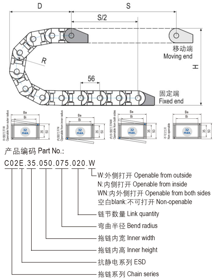 C02E.35抗靜電通用型塑料拖鏈是應用范圍廣泛的產品,簡單而多功能的組裝結合堅固性,高強度配合更安靜的運動,更長的電纜壽命和許多安裝選項