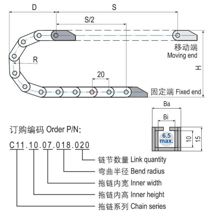 C11.10微型塑料拖鏈體積極小,基于一片式設計重量輕特別適用于高速運動。C11.10微型塑料拖鏈適用于較小安裝空間,多種尺寸規(guī)格可選。