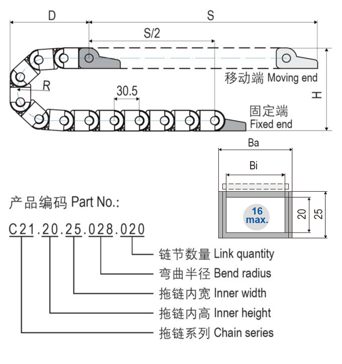 C21.20微型可打開式電纜拖鏈體積較小,基于兩片式設計重量輕特別適用于高速運動;C21.20微型電纜拖鏈適用于較小安裝空間,3種內寬規格可選...