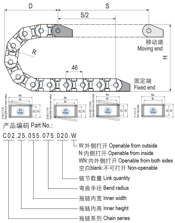 C02.25通用型塑料拖鏈是應用范圍廣泛的產品,簡單而多功能的組裝結合堅固性,高強度配合更安靜的運動,更長的電纜壽命和許多安裝選項